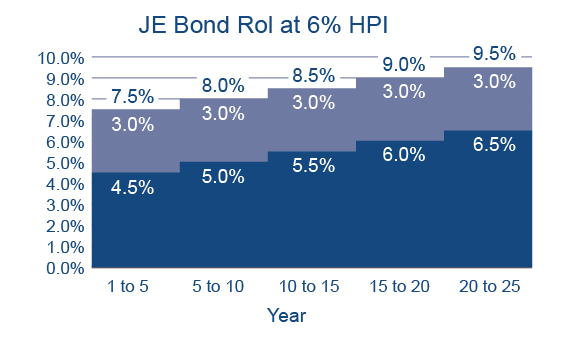 Based on a projected HPI of 6% pa compound growth over the life of the bond, if we consider that capital return in addition to the income return, the total return to bond holders including the terminal bouns is effecitvley this total return pa.